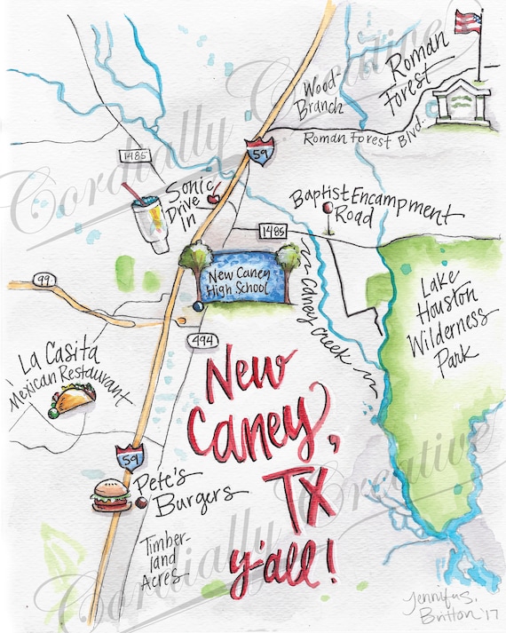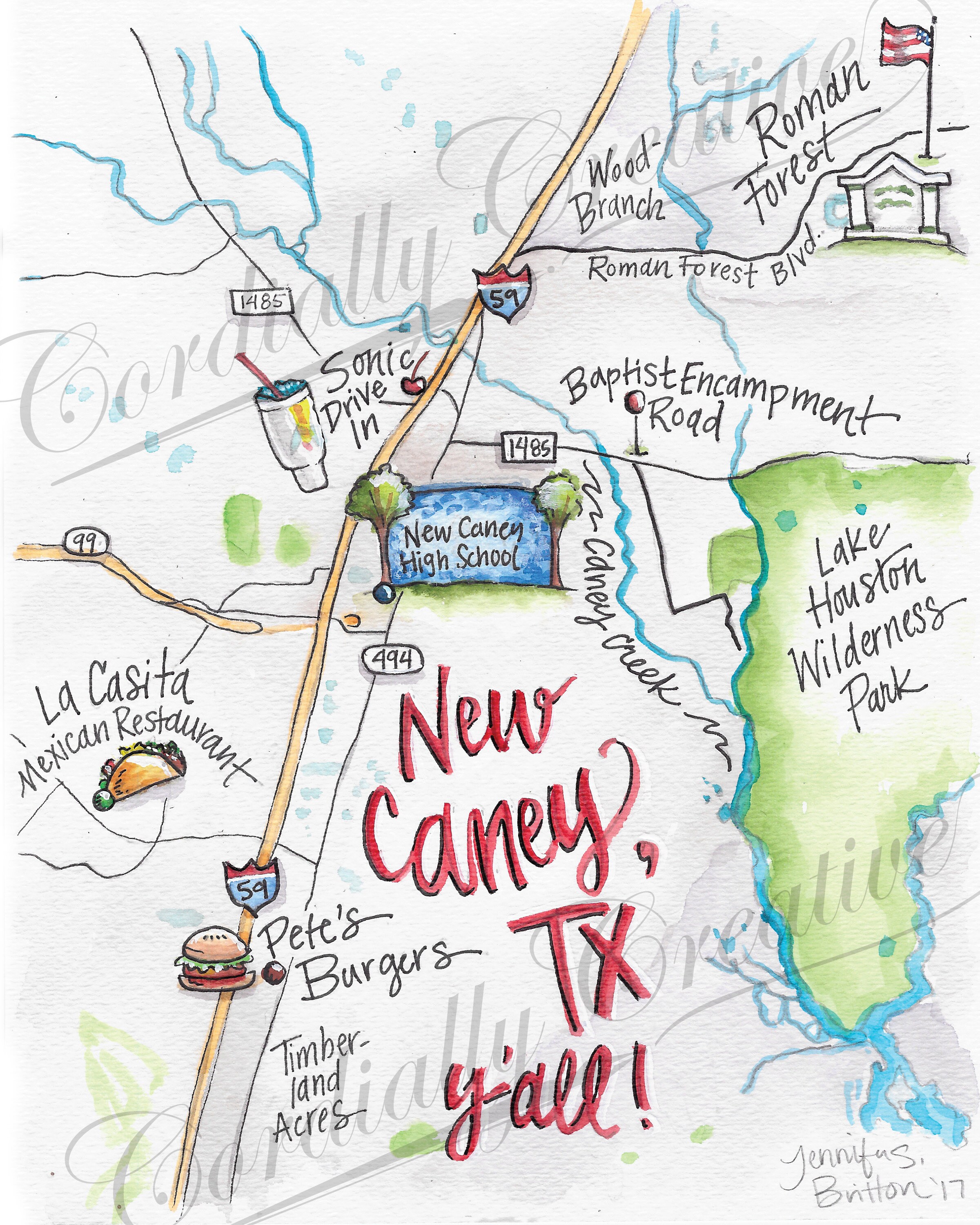 Best Places to Live in New Caney (zip 77357), Texas New Caney TX Map watercolor illustration print 8x10 inches .